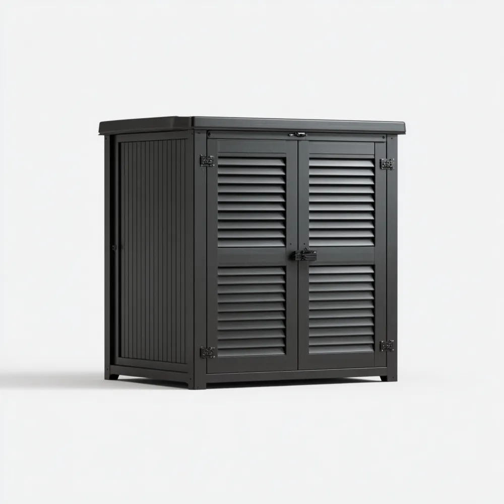 Material und VerarbeitungGefertigt aus hochqualitativem, wetterfestem Metall in einem stilvollen Anthrazit-Farbton. Die Lamellentüren sorgen für eine gute Belüftung und verhindern Feuchtigkeit im Inneren.